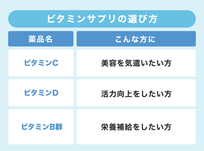 ビタミン剤の種類は様々で、美容目的から健康維持、活力サポートなど様々な目的ごとに選ぶべきビタミン剤は異なります。