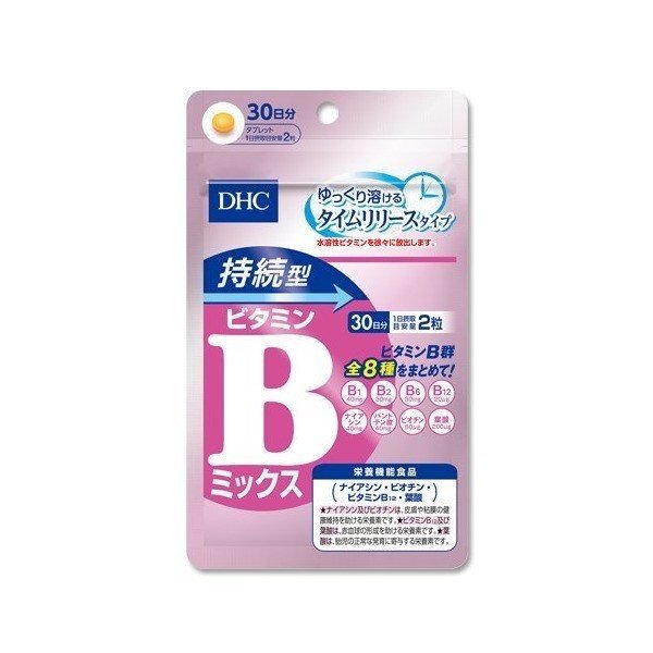 ビタミンB群とは、ビタミンB1、B2、B6、B12、ナイアシン、パントテン酸、ビオチン、葉酸の8つのビタミンの総称です。ビタミンは身体にとって必要な栄養素であり、不足すると体調に影響が出やすくなったりします。DHCの持続型ビタミンB群は、ビタミンCと同じく水溶性ビタミンであるビタミンBを、ゆっくり効率よく吸収されるように加工したビタミン剤です。価格も安いため、ビタミンB群ではファーストチョイスですね。